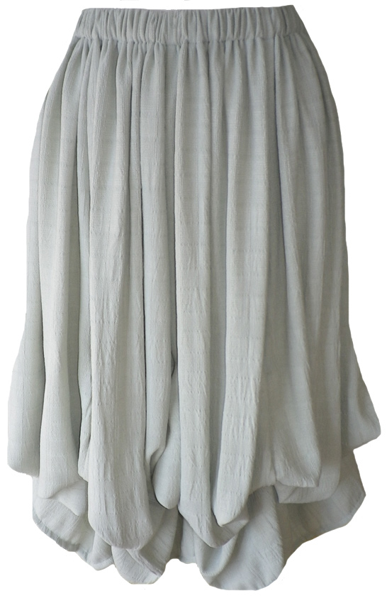 (lovely light green rayon fabric with a subtle checked texture [also available in other fabrics as shown in swatches]; composed of eight panels of fabric with inside ties to ruche it up as desired; elasticized waist; no pockets)
